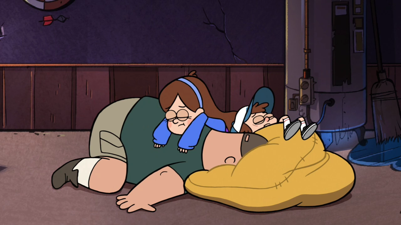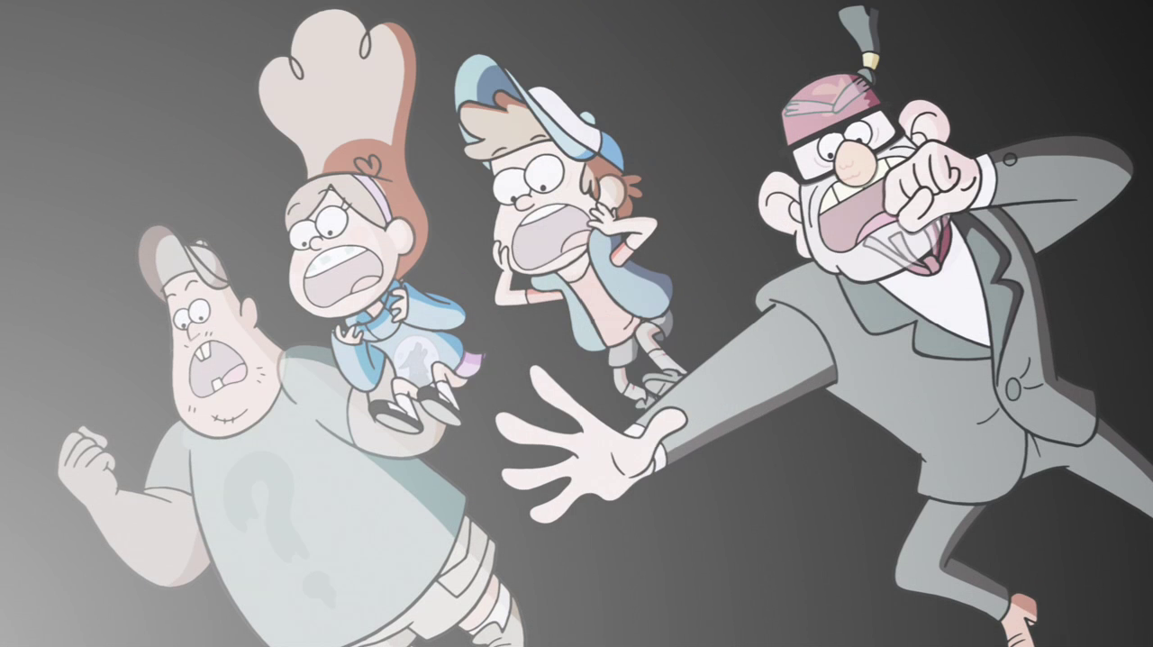 Dipper then tells Mabel that they already know that story, as it just happened to them and they are currently living through it, which causes Soos to ask how the story ends. Dipper then spots a bright light at the end of the tunnel, and he and the others get closer and closer while screaming. Eventually they finally fall through it, however the group comes out at the top of the pit, right where they fell in, and learn that no time has passed. Dipper concludes the bottomless pit is a wormhole of some sort, to which the others agree. When Stan points out that no one will likely believe any of them if they tell anyone about the pit, Mabel adds that this is probably one of those things that they should just keep to themselves, which the others agree to. Stan proceeds to lean on the sign for the pit and falls back in when it breaks, but this does not worry the others, as he will eventually come right back. In the credits, a bored Stan is seen falling down the pit, with a grumpy face, sighing.