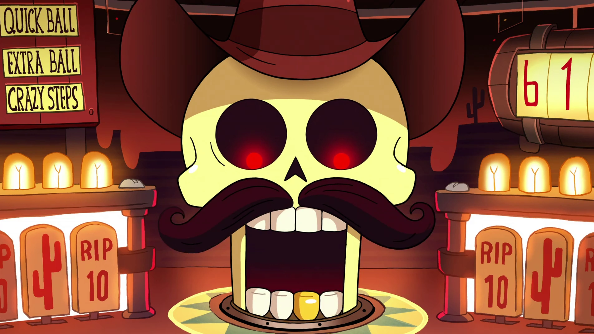 The talking cowboy skull in the pinball machine.