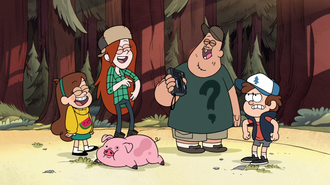 Mabel, Soos, and Wendy are playing a variant of spin the bottle called "spin the pig," in which they spin Waddles and whomever his face points at, he or she must kiss him. When the pig points to Stan, who is sitting on the porch nearby, Mabel asks him if he has ever kissed a pig, and Stan answers he's not going to answer that. Dipper abruptly enters in a panic, believing that a snake bit him and that he must be taken to a hospital stat. Unfortunately, his voice cracks at the end of his exclamation, consequently not being taken seriously by Stan and the others, who explain that it is hard to focus on the seriousness of the situation with Dipper's voice frequently cracking. They then play a techno remix of Dipper's voice cracking, which irritates and embarrasses him into taking the tape and storming off.