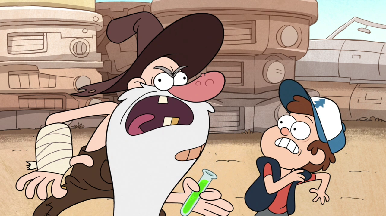 As Dipper walks through town, he is met by Old Man McGucket, who says that he may be able to help Dipper and his problem. At the Gravity Falls Junkyard McGucket explains that he has been experimenting with a voice-altering formula, due to his frightening voice that he exhibits by scaring a young child, and gives Dipper a sample of the formula. Dipper drinks it and heads back to the Shack, McGucket saying that Dipper will sound like a new man if he survives as he does so. The next morning, Dipper awakes and discovers his new, deeper voice which he tries out and shows to Mabel. His sister does not react as he expected, however, and, thinking Dipper's body is being inhabited by a body swapping warlock, hits her brother with a golf club. Dipper explains that he is indeed her brother, albeit with a different tone, and goes on to describe the potential benefits he sees, such as, prank calls. His sister believes it to be a change for the worse, and Soos reacts in manner similar to Mabel upon hearing Dipper's new tone, telling the tourists present in the gift shop to flee, and hitting Dipper on the head with a broom, screaming that Dipper must be killed with fire.