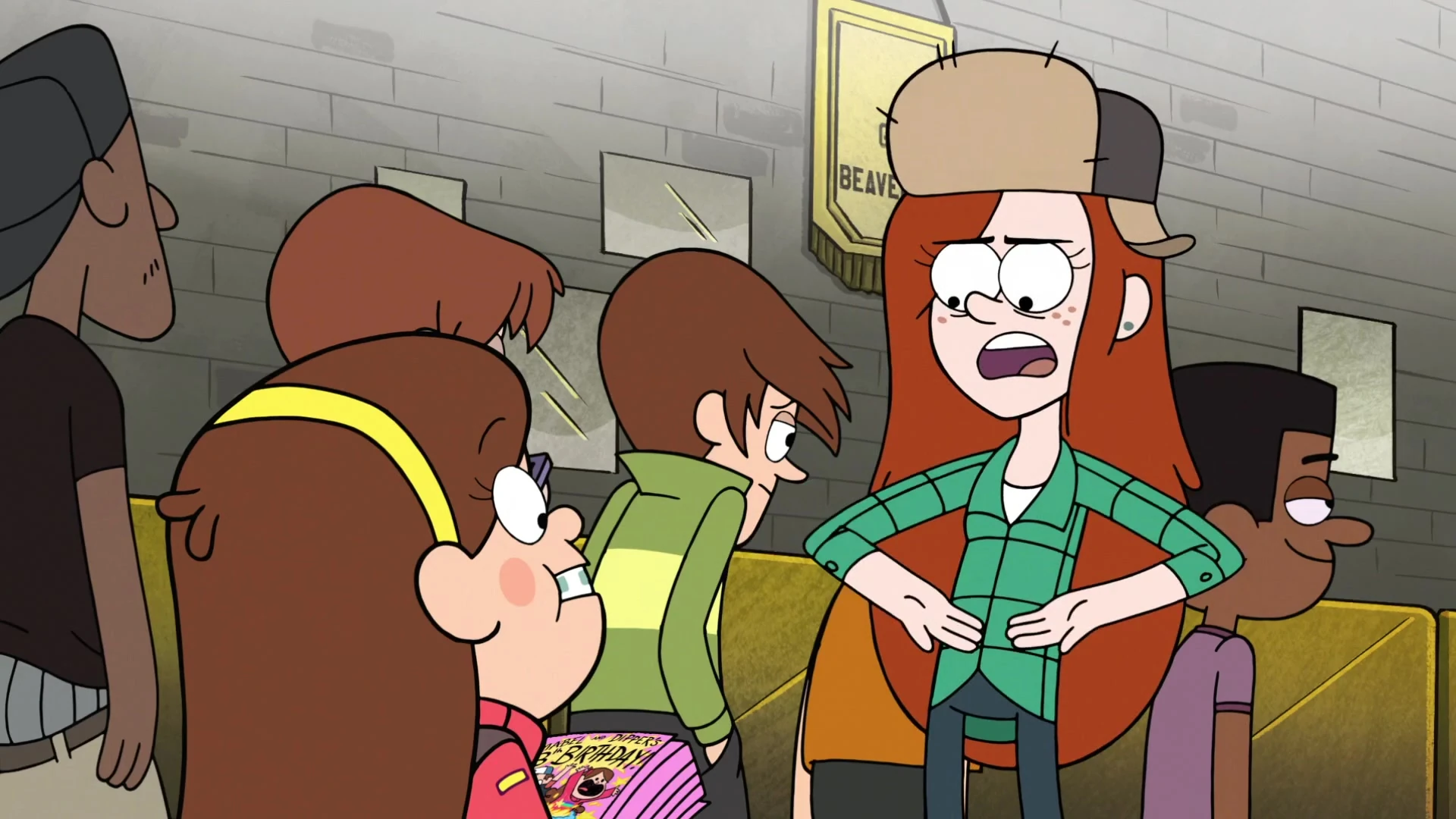 Mabel and Soos head to Gravity Falls High School, where Lee and Nate are rearranging the letters on the school's sign. The two go into the gym, finding lines of despondent high-schoolers. Mabel finds Wendy and asks her what's happening. Wendy explains that it's registration day and that no one is happy about it. Mabel is confused, thinking high school is fun and song-filled, just like on TV. Wendy says that TV's portrayal is a lie and that if Mabel can avoid growing up, she should. Everyone in the gym promptly laughs at Wendy as the man in charge of registration mispronounces her name, leaving Wendy embarrassed.