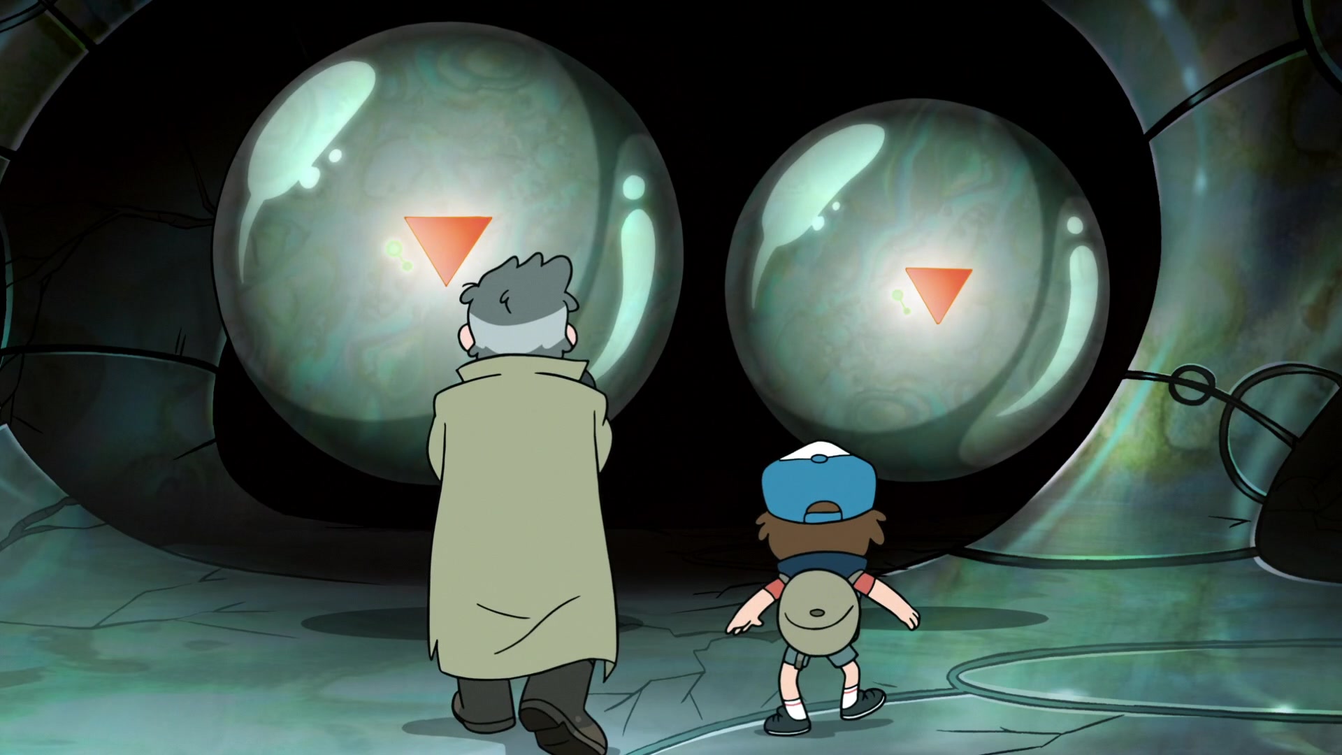 Ford and Dipper reach their destination - a large hill overlooking the floating cliffs of Gravity Falls. Ford remarks on how the cliffs look seemingly unnatural and oddly shaped, and Dipper realizes what Ford means when he holds a UFO keychain in front of him. Ford reveals to Dipper that the valley of Gravity Falls was created millions of years ago, when a spacecraft of some kind crash-landed into the area, creating the shape in the cliffs. The spacecraft is now buried under the town. Ford has had a lot of experience with the craft, having raided its parts to build the universe portal. He assures Dipper that all of the aliens inside have "probably" been dead for millions of years. Ford opens a hatch on the hill using a magnet gun, and the two head down it, into the depths of the spacecraft.