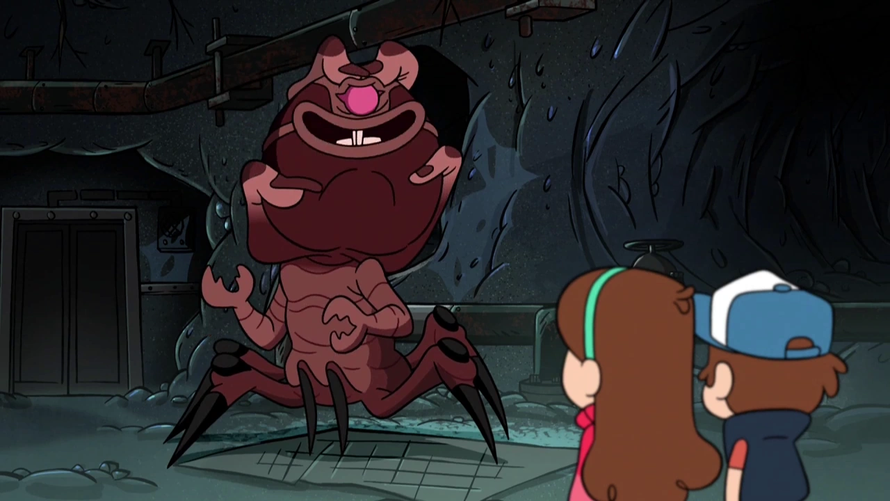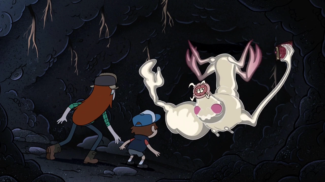 Dipper and Wendy run into Mabel and Soos, though they are suspicious that they may be their pursuer in disguise. However, after observing their goofy behavior, they are reassured their friends are who they appear to be. Dipper worries that if the creature escapes, he could assume the form of anyone, and Wendy prepares to launch an attack on him. While the Shape Shifter looks for Dipper, his target and Mabel enter the room. The monster then transforms into a horrifying amalgamation of the twins, who lead him toward Soos and Wendy, who have prepared a water pipe to blast him. The pipe briefly stalls, and Wendy goes after the monster with her ax before getting hit with a huge burst of water.