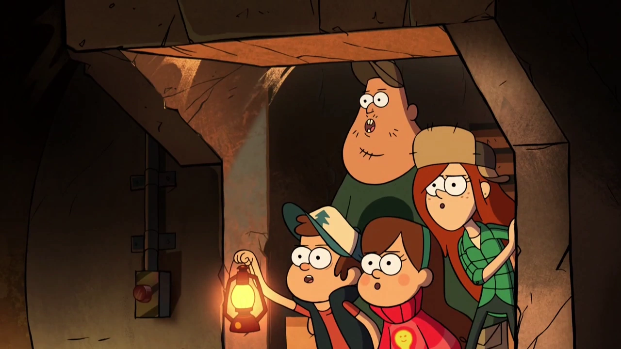 Wendy points out a branch that resembles a lever. As Dipper tries to think of a way to reach it, Wendy easily climbs up to it using her belt. She hits the switch with an ax and opens the entrance to a hidden bunker, and Dipper has the group promise not to tell anyone about what they may see. They descend the staircase and find an old fallout shelter, complete with rations to last at least to the year 2070. Dipper finds a recently opened can which prompts Soos' suspicion that the author may still be alive, and Wendy finds a hidden passageway, behind a map of Gravity Falls.