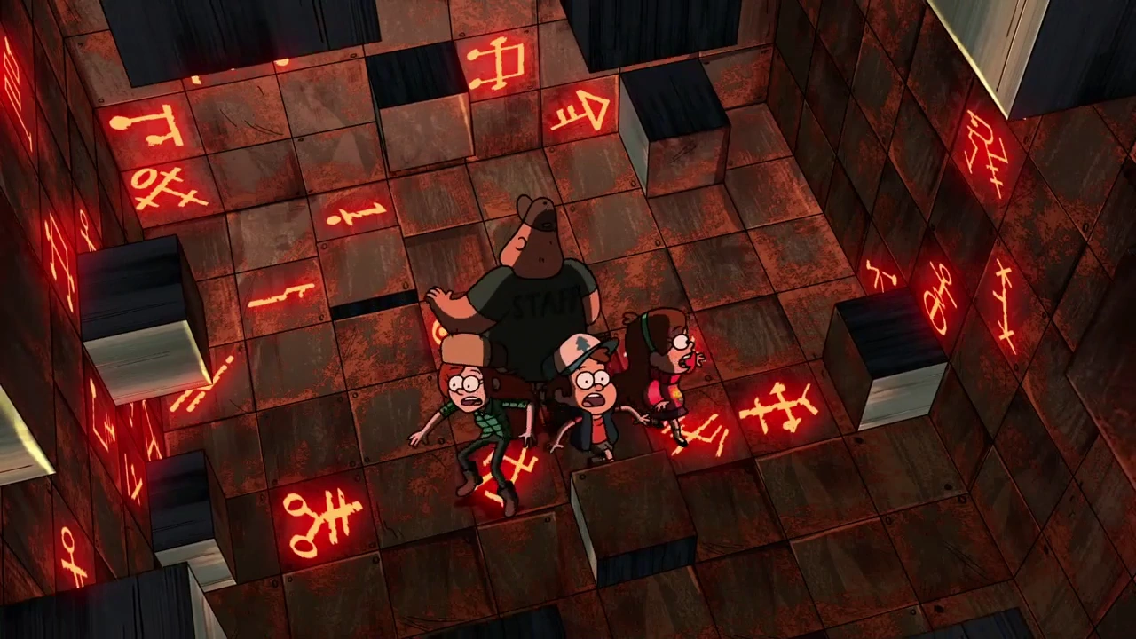 The four arrive in a small room with various symbols in it, and Soos and Wendy comment on the "creepy" feel of it. Mabel jokes that Dipper's internet history tops the room's eeriness, and accidentally pushes him onto a button, inadvertently setting off the security system. As the walls start pushing in, the gang turn to the journal for a solution, and they find they can open an escape hatch by pressing four symbols. They barely make it out, and Dipper's vest gets caught between the closing stones. As they inspect a surveillance room, Mabel goes to retrieve her brother's vest and finds a love letter he wrote to Wendy, and she encourages him to show his true feelings. Dipper declines her request, and she pushes him into a closet with Wendy.