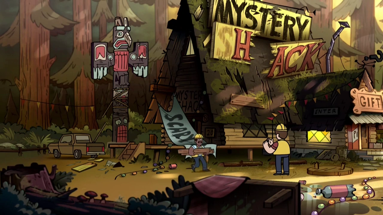 Meanwhile, Stan supervises a construction crew repairing the Mystery Shack. When a worker inquires ask to what caused the damages, Stan, not wishing to reveal the zombie incident, lies and says it was a "big woodpecker." He then bribes the man, who accepts. He wonders where the others are, and the scene cuts to Soos and the twins gathered around the spot where Dipper first found Journal 3. Dipper informs the others that he has uncovered a new lead on the author's whereabouts — a hiding spot under a tree. Wendy then arrives and talks about how she had been wanting to come with the gang for some time, but has been stuck cleaning up after her father. Mabel pulls her brother aside to tease him about his crush on Wendy, but he dishonestly informs her that he is over her, though she does not believe him.