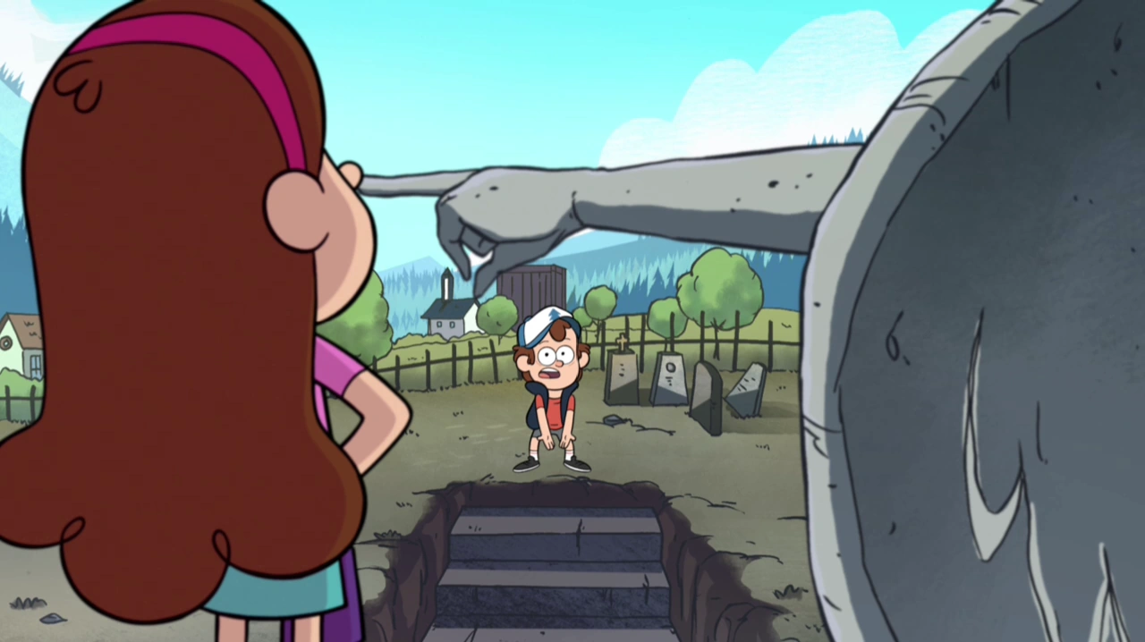 Once at the cemetery, Mabel sees the statue, and she pretends that the statue is picking her nose. She bends the statue's finger, opening a secret passageway. Mabel and Dipper enter it, and Dipper says to watch for booby traps, and Mabel then laughs at his words. They go down the hallway when Mabel steps on a tile, which triggers tranquilizer darts. They dodge the darts and go down a hallway revealing many top secret documents (e.g., Abraham Lincoln's hat was covering up a hand on his head; Ben Franklin secretly was a woman).