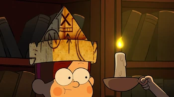 Dipper and Mabel head to the library to look up the symbols on the map. Dipper finds a symbol that means fire and is the same shape as the picture on the documents. Dipper thinks they should burn the document until Mabel makes a hat out of the paper, and she thinks this was silly, but it actually shows them a map to the Gravity Falls Museum of History.