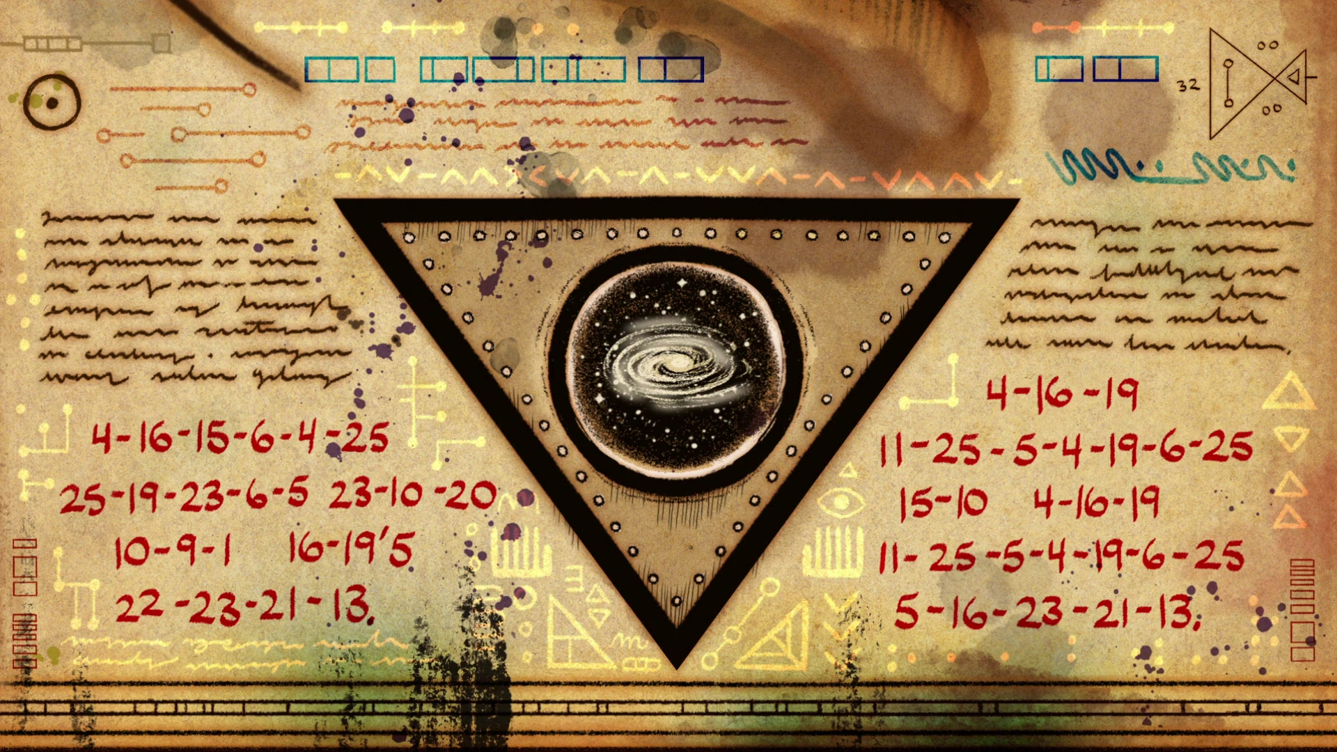 - The page section revealed at the end of the episode says, "4-16-15-6-4-25 25-19-23-6-5 23-10-20 10-9-1 16-19'5 22-23-21-13." (left) and "4-16-19 11-25-5-4-19-6-25 15-10 4-16-19 11-25-5-4-19-6-25 5-16-23-21-13." (right). After using the combined cipher, it translates to "THIRTY YEARS AND NOW HE’S BACK. THE MYSTERY IN THE MYSTERY SHACK."