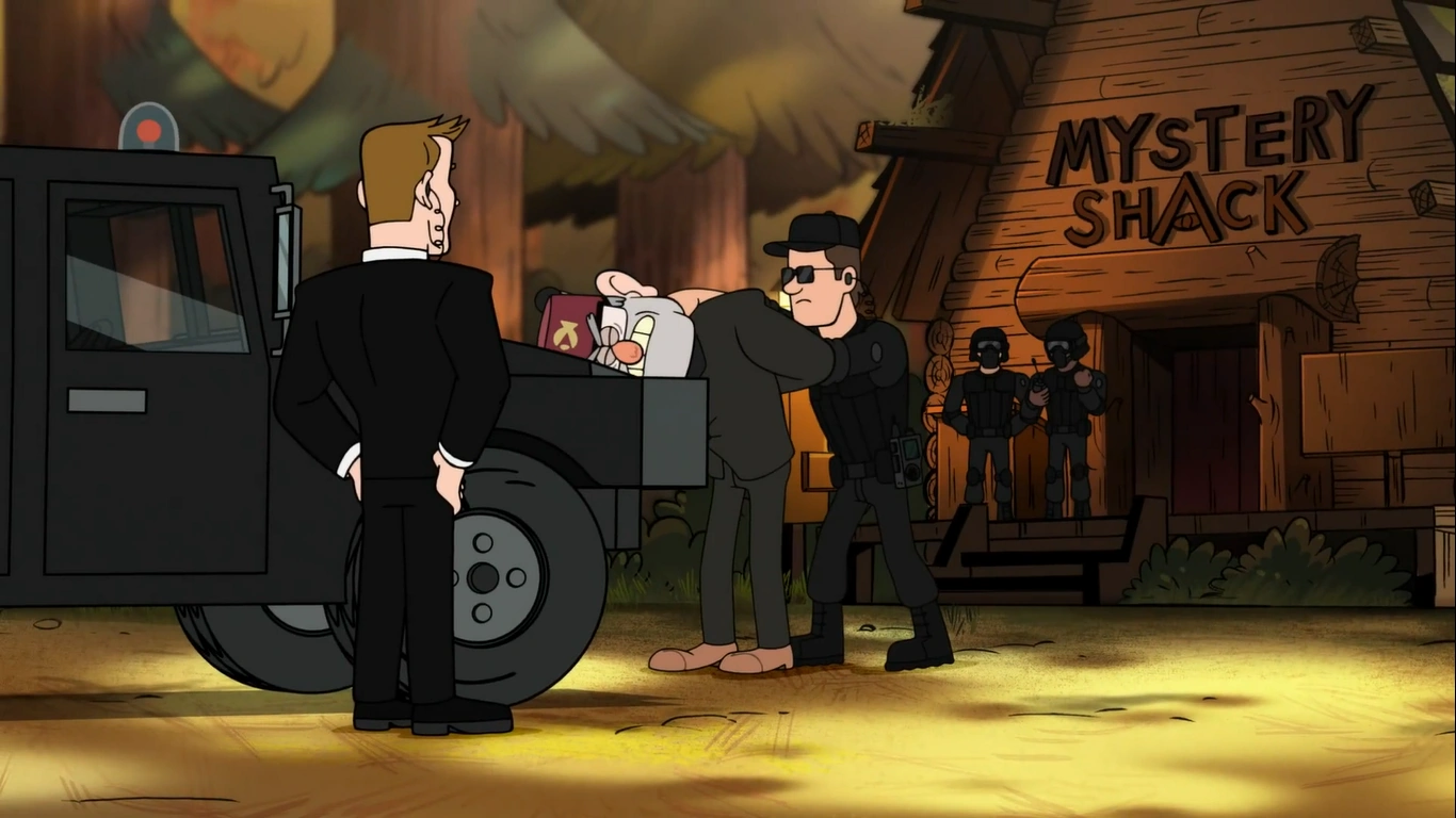 The next day, Mabel wakes Dipper up to show him a closet full of fireworks. Stan invites them to set them off on the roof. While the twins are playing around, Stan attempts to tell them his secret but fails. As he resolves to tell them the truth later that day, a heavily armored operator proceeds to tackle him, and Agent Trigger comes up behind him to signal the rest of the tactical team to secure the Mystery Shack. Worried and perplexed, Dipper and Mabel inquire what is happening, before they notice Agent Powers and Trigger, whom Dipper thought they had been eaten by zombies. The agents tell the children that an unknown person stole toxic chemicals the night before, and they suspect that the culprit is Stan. They then proceed to put Stan in their car, sending him away to be interrogated. They also take Dipper and Mabel and inform them that they will be going to child services.
